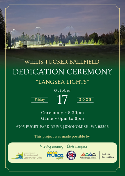 "Snohomish County is pleased to announce that the Willis Tucker Park Ballfield Lighting Project is now complete, bringing evening play capability and enhanced accessibility to Field 2 at Willis Tucker Park.