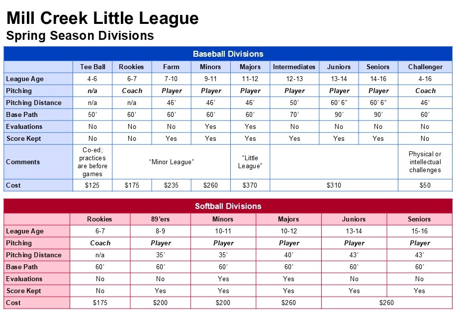 We offer several divisions during the regular Spring Season. Differences include ages, pitching distances, base path length, coach vs. player pitching, etc. Learn more about the various baseball and softball divisions. (Note: Not all divisions are formed each year, it depends on if there are enough players to form a team. We may combine upper divisions or partner with other leagues in order to create a team.)